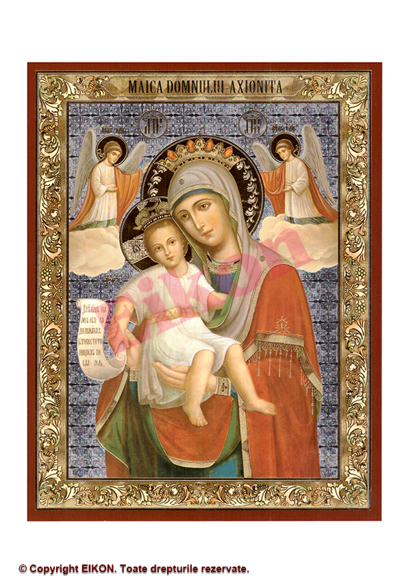 Nu necesită înrămare, finisată, cu suport de prindere. Icoana este pastrata in biserica protaton, biserica centrala din careia si cea mai veche din sfantul munte athos. Icoana făcătoare de minuni a maicii domnului axioniţa se găseşte în paraclisul sfinţii părinţi ioachim şi ana, mănăstirea sihăstria. Icoana maicii domnului numita axion estin, ceea ce inseamna vrednica esti, este una dintre cele mai renumite si iubite icoane din biserica ortodoxa. 30 / 40 cm, 35 / 50 cm, 50 / 70 cm.prăznuirea acestei icoane are loc în fiecare an, pe data de 12 iulie.